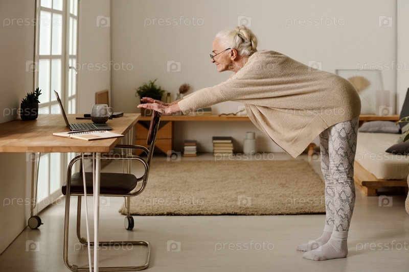 Женщина занимается физическими упражнениями во время работы в сети