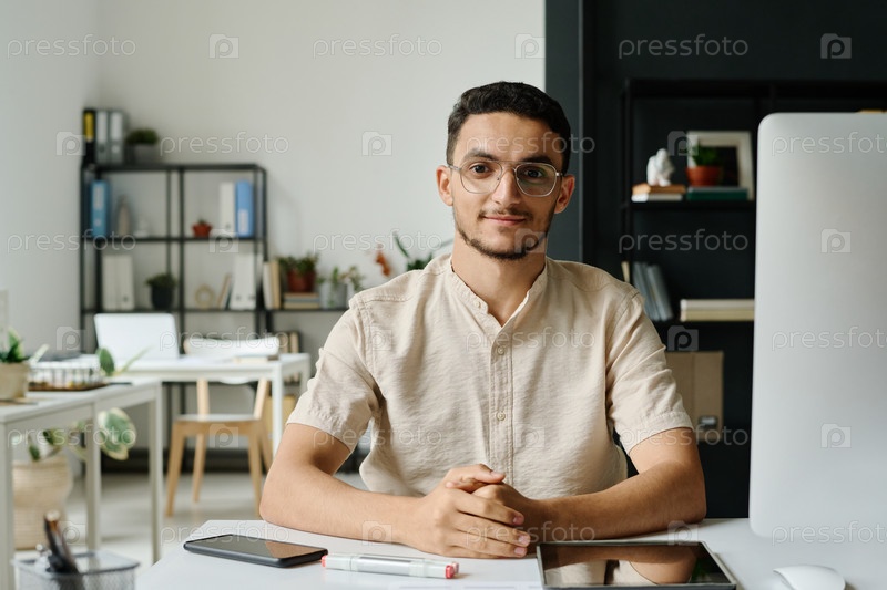 Молодой предприниматель сидит у рабочего места