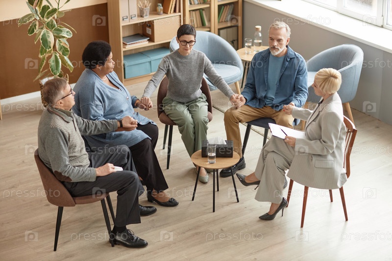 Пожилые люди, держащиеся за руки во время сеанса терапии