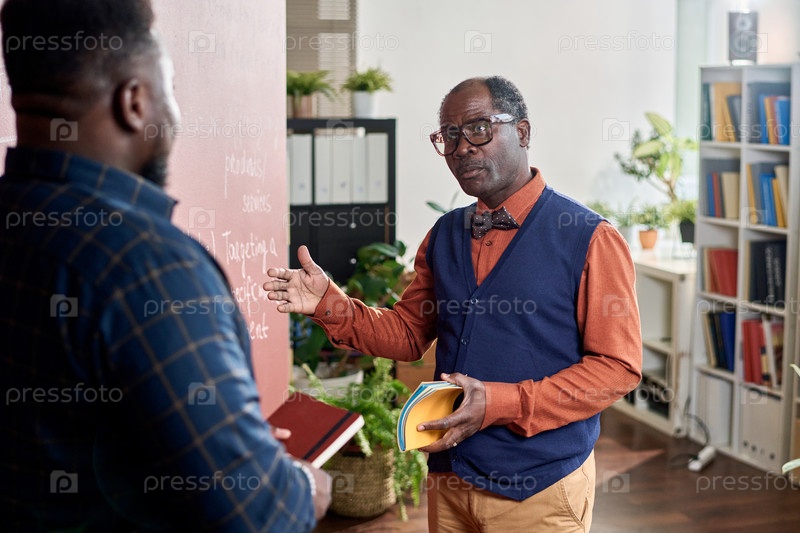 Профессор чернокожего колледжа разговаривает со студентом, стоящим у доски