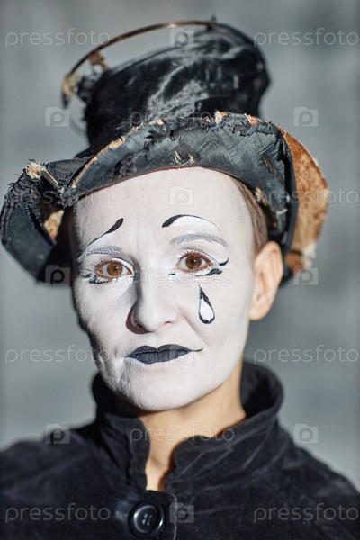 Близкий мим, смотрящий на камеру с макияжем слезы