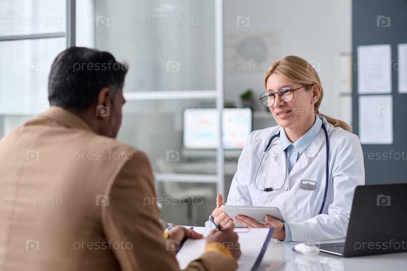 Улыбающаяся женщина-врач разговаривает с мужчиной из Ближнего Востока