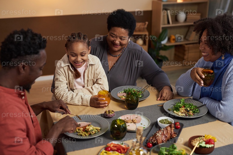 Счастливая чернокожая старшая женщина наслаждается ужином с семьей