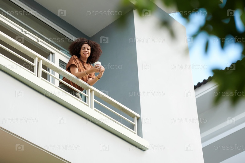 Женщина, стоящая на балконе с кофе