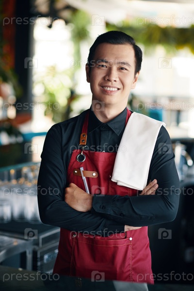 Улыбающийся бармен, работающий в ресторане