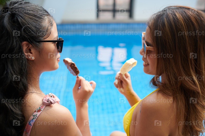 Улыбающаяся мать и дочь едят мороженое