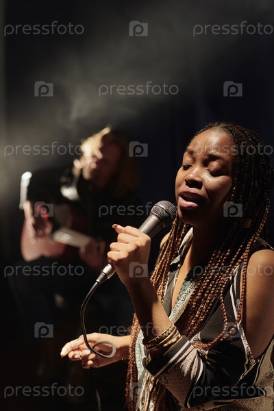 Черная женщина-музыкант поет в микрофон на сцене с группой