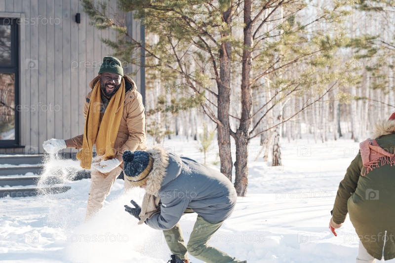 Счастливый мужчина бросает снежный мяч своему сыну