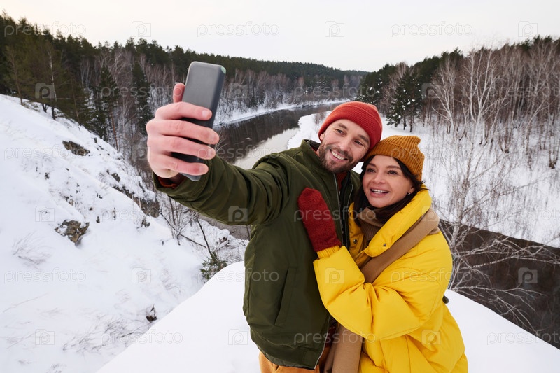 Счастливый мужчина и женщина делают селфи в зимний день