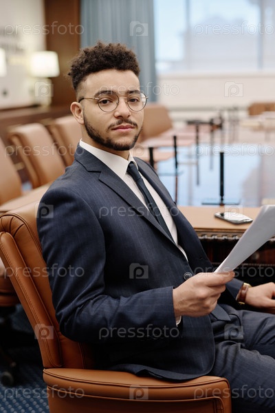 Молодой адвокат в формальной одежде сидит в кресле, держа документы
