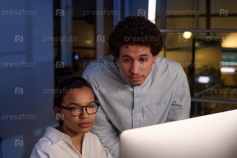 Молодые коллеги обсуждают проект поздно вечером
