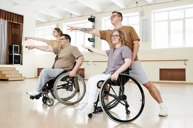 Мужчины и женщины практикуют танец на инвалидном кресле