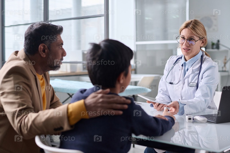 Заботливая женщина-врач консультирует заботливую семью