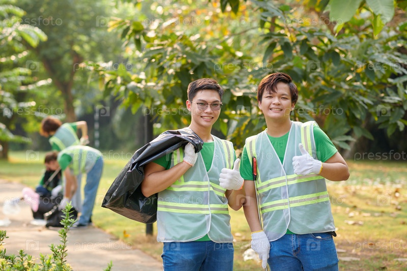Улыбающиеся волонтеры показывают большие пальцы вверх