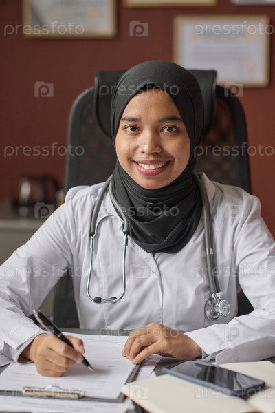 Женщина-врач в хиджабе позирует за своим столом, выполняя бумажную работу