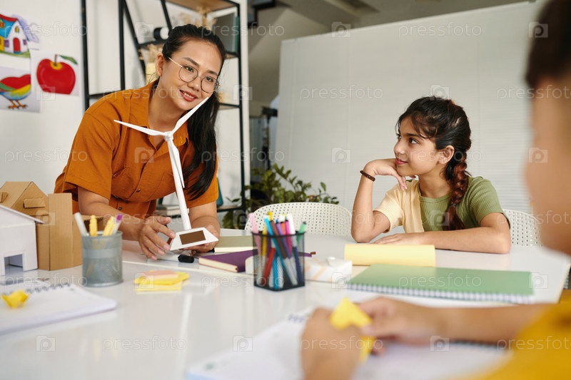 Учитель показывает модель ветряной турбины