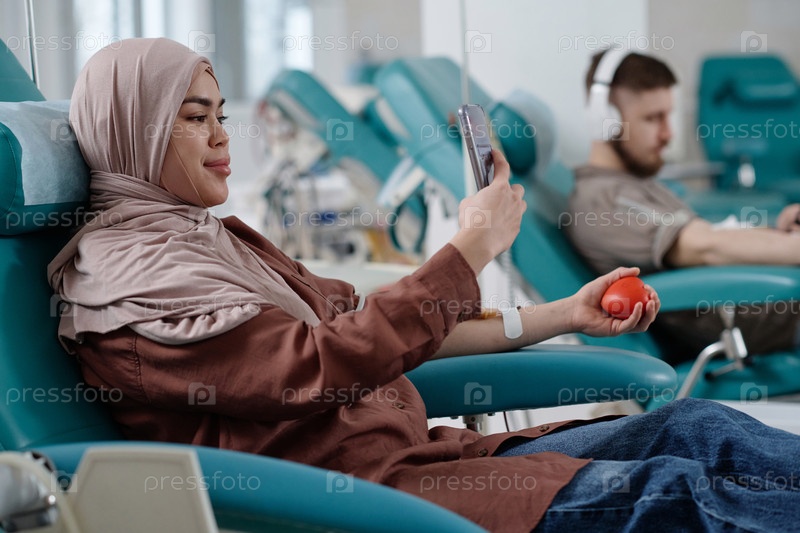 Молодая донорница крови в хиджабе делает селфи на медицинском стуле