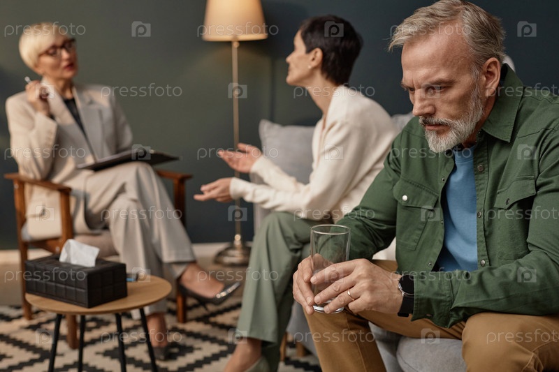 Зрелый мужчина держит стакан воды во время терапии пары
