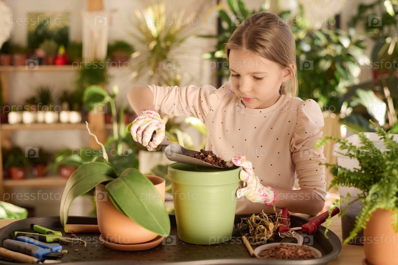 Девочка-подросток пересаживает комнатные растения