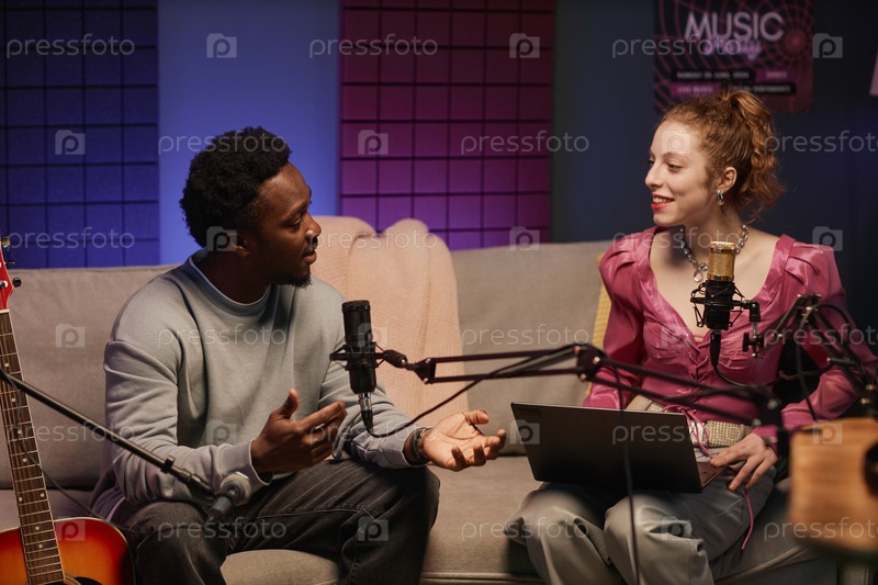 Музыкант-мужчина отвечает на вопросы женского подкастера