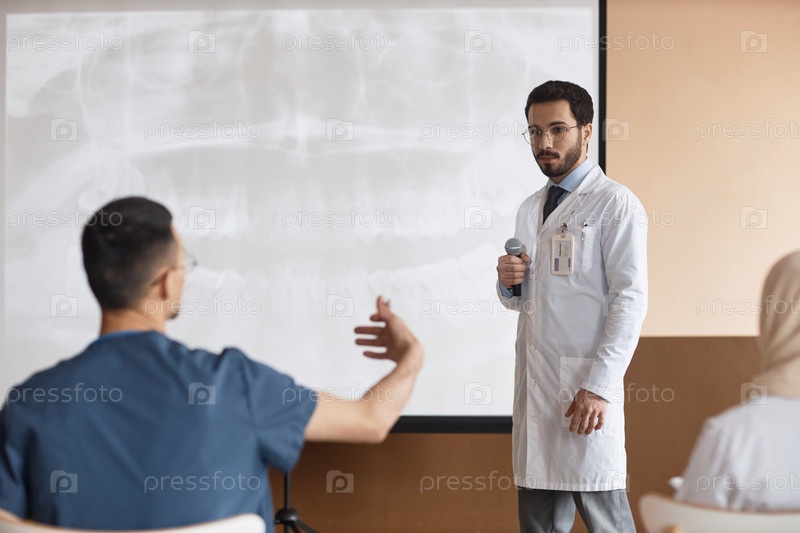 Медицинская презентация Спикер слушает вопросы мужской аудитории