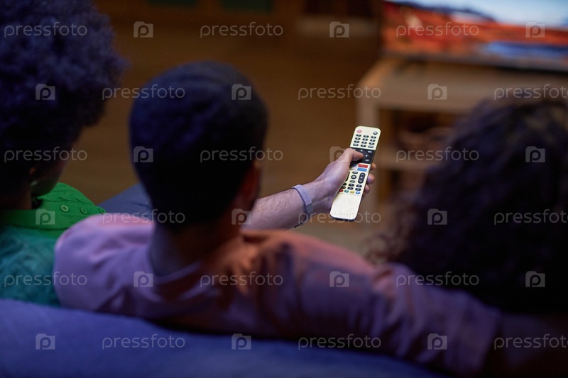 Высокий угол человека, держащего пульт дистанционного управления и смотрящего телевизор