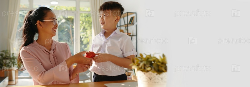 Баннер с надписью 'Учительница дарит школьнику яблоко'