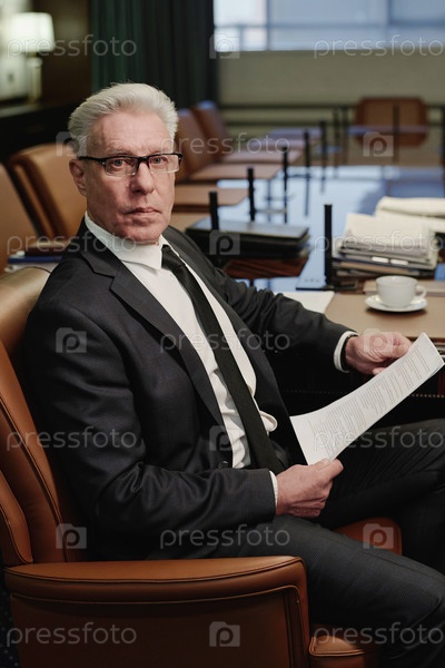Сероволосый офисный работник позирует на своем рабочем месте, делая бумажную работу