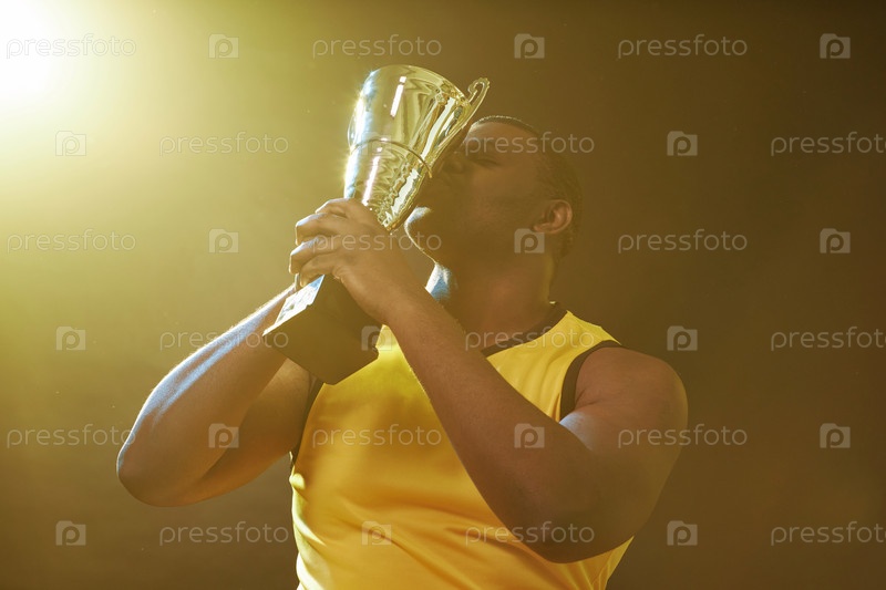 Черный спортсмен-мужчина целует трофей и празднует победу