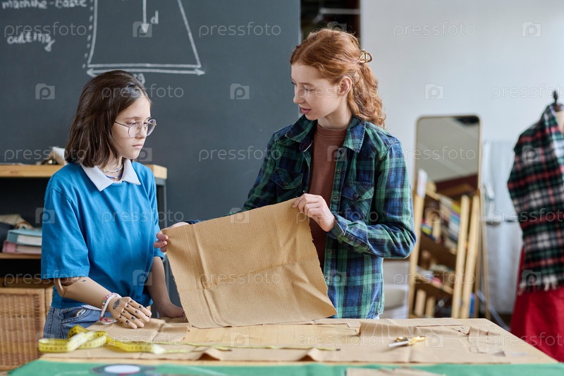 Две девочки-подростки шьют одежду на уроке шитья