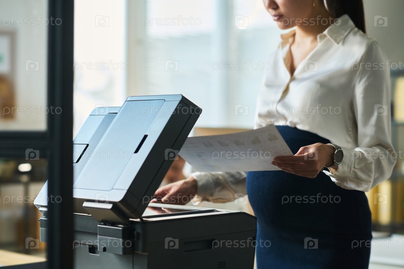 Беременная деловая женщина, использующая копирующую машину