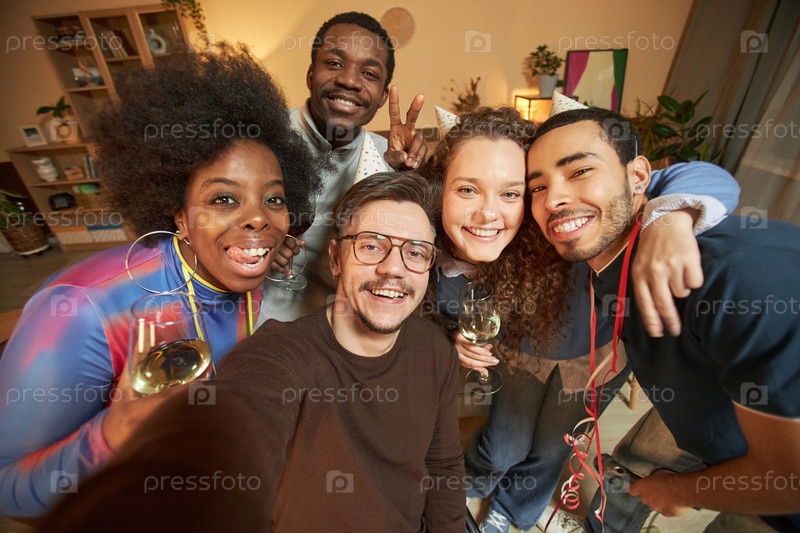 Друзья, которые делают селфи дома и улыбаются на камеру