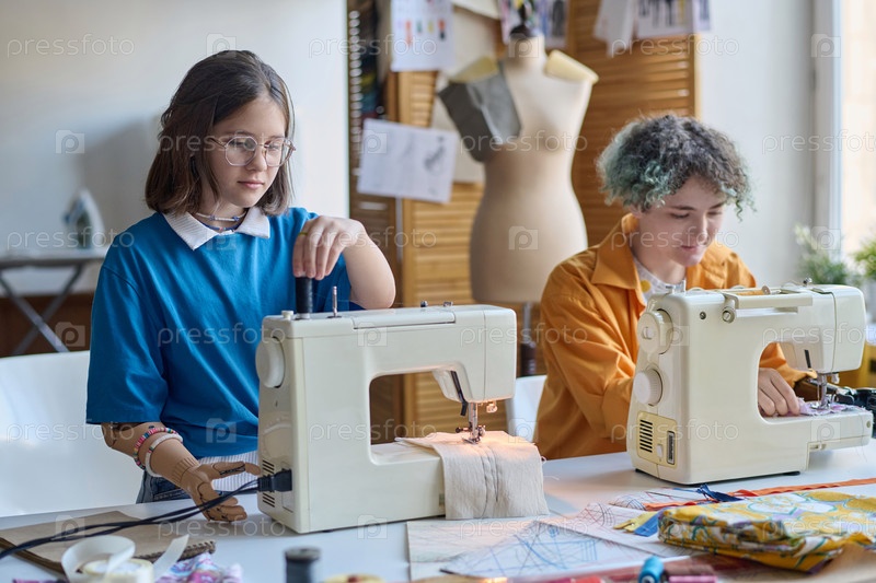 Две девочки-инвалиды, использующие швейные машины в школе или ателье