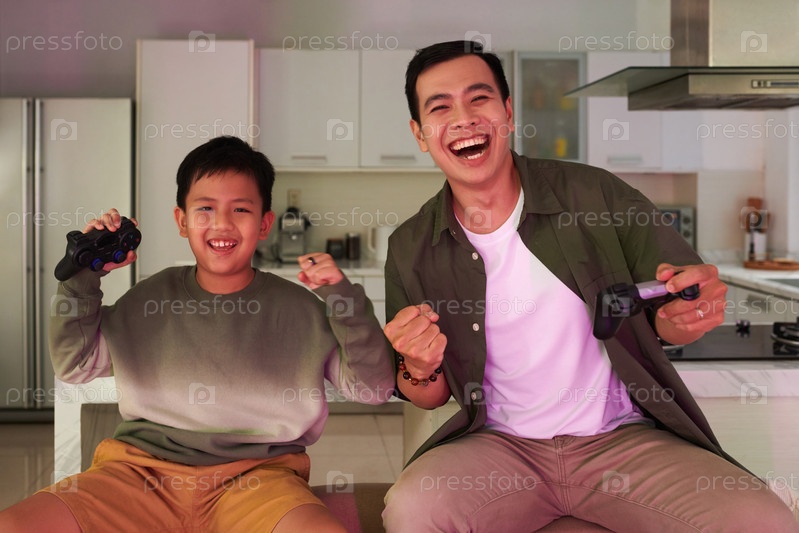 Отец и сын выигрывают видеоигра
