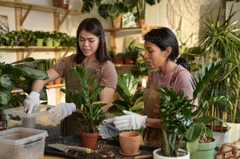 Две садоводы пересаживают растения из одного горшка в другой