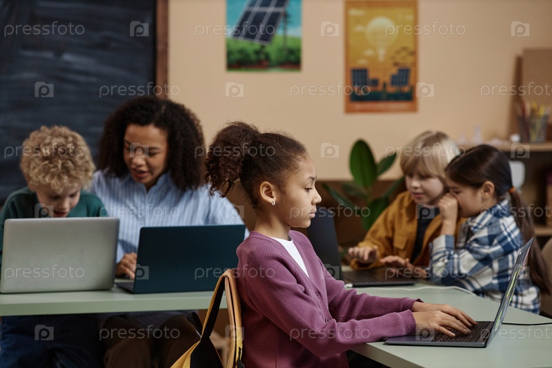 Молодая чернокожая девушка использует ноутбук-компьютер в классе ИТ