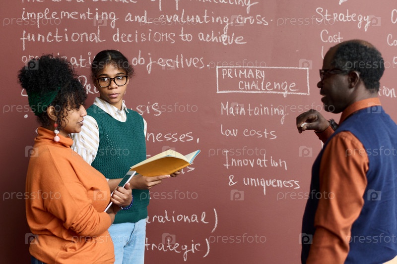 Две чернокожие девочки разговаривают с профессором, стоя у доски в классе