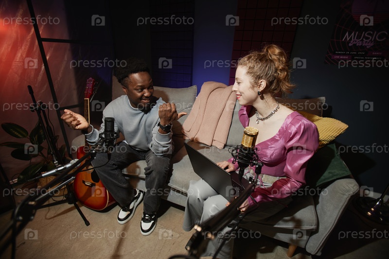 Музыкант дает интервью на подкасте мужского пола