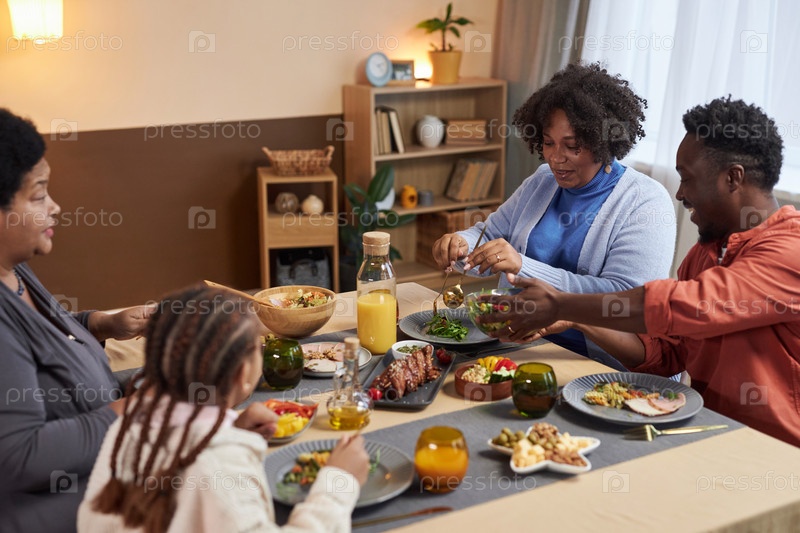 Три поколения чернокожих семей делятся едой за столом