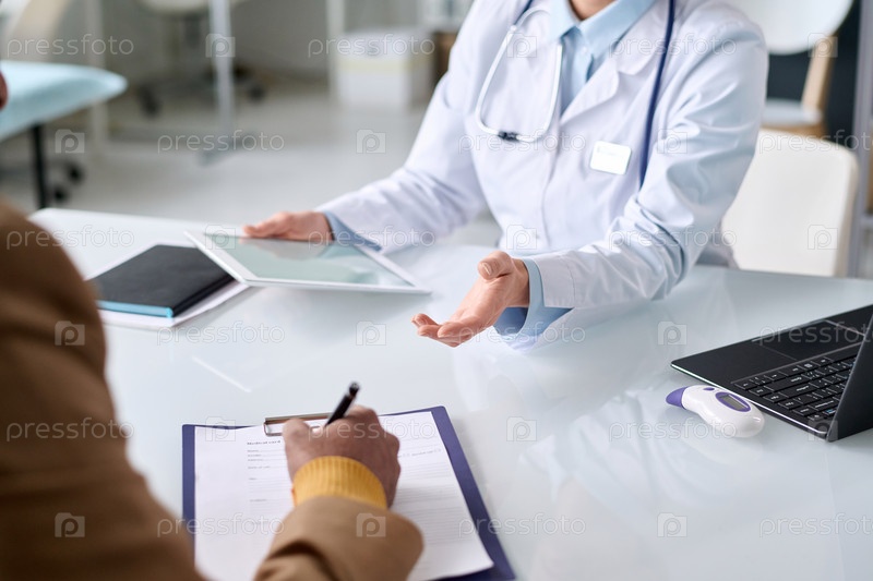 Человек, подписывающий карту пациента в клинике