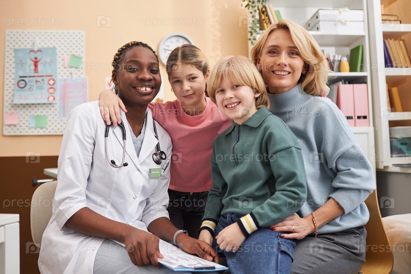 Врач с семьей смотрит на камеру
