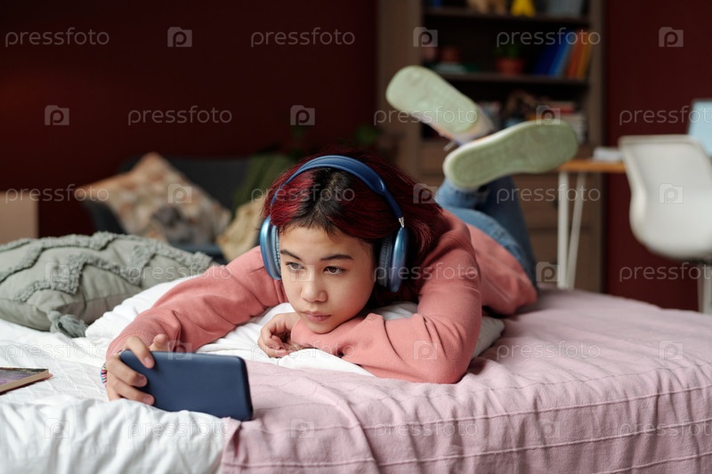 Девушка-подросток расслабляется со своим смартфоном