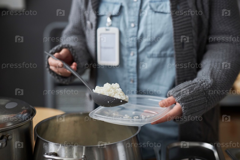 Женщина, работающая волонтером в суповой кухне, кладет рис на тарелку