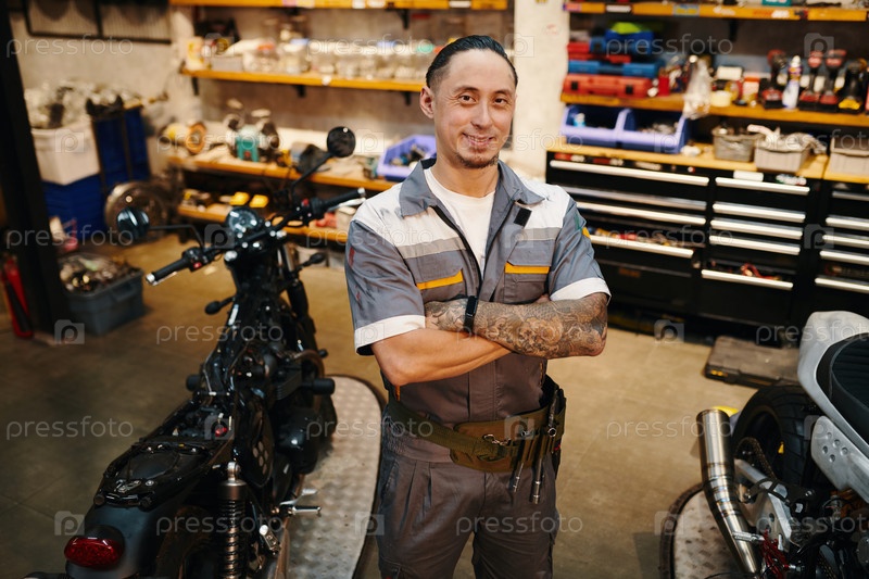 Ремонтник работает в гараже мотоциклов