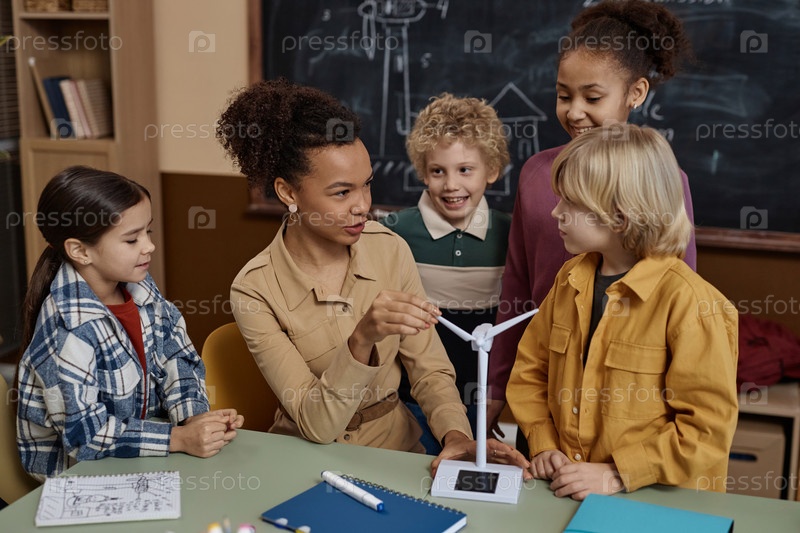Разнообразная группа детей в школе слушает учительницу