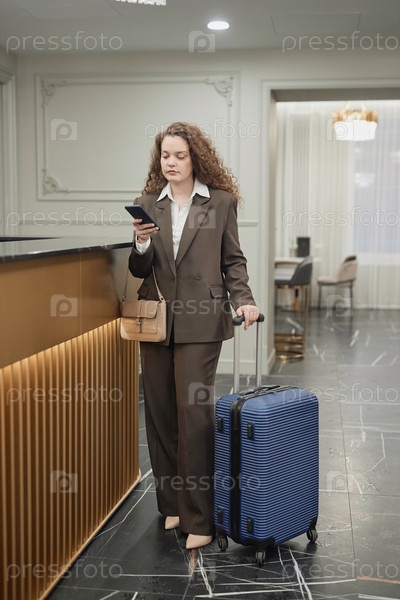 Деловая женщина с чемоданом ждет в гостиничном лобби