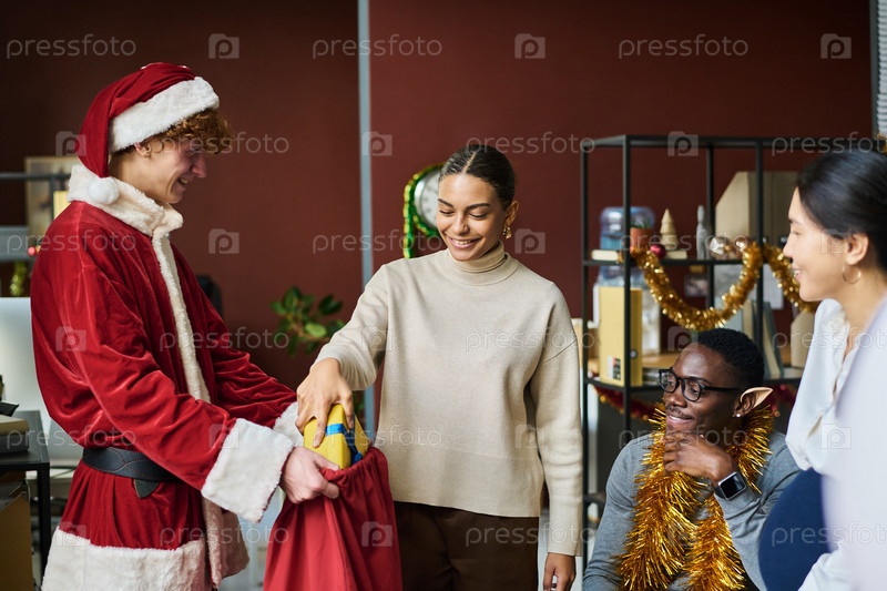 Женщина выносит коробку с подарками из красного мешка