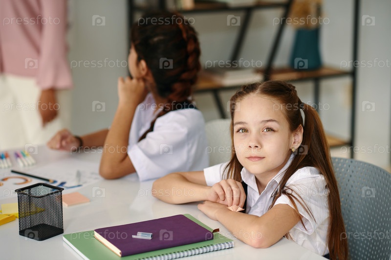 Усердная школьница, сидящая за рабочим столом