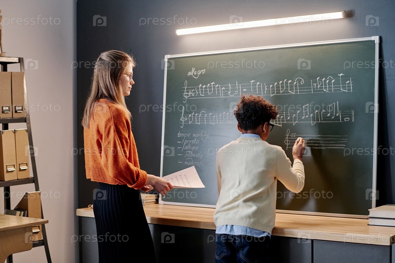 Учительница смотрит, как ее ученик пишет заметки на доске