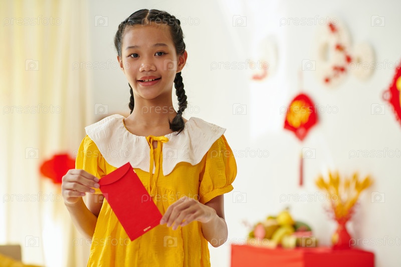 Девушка, держащая конверт с счастливыми деньгами